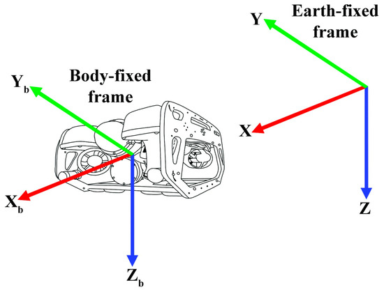 Fossen [18] details the main reference planes for the construction of the mathematical model of an underwater vehicle. One of these reference frames is the one fixed to the Earth (Earth-fixed frame), while the other is relative to the vehicle-body-fixed frame. Both frames present orthogonal axes, denoted as X, Y and Z, to refer, respectively, to the Earth-fixed frame plane and the body-fixed frame plane . These concepts are visually illustrated in Figure 1 and notation is shown in Table 1.