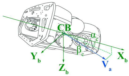 The current velocity is identified as while the relative orientation of the currents is described by the angles of attack and slip angles . In the specific context, represents the current coming from the north, is that coming from the east, and is that arising from the depths, as illustrated in Figure 9.