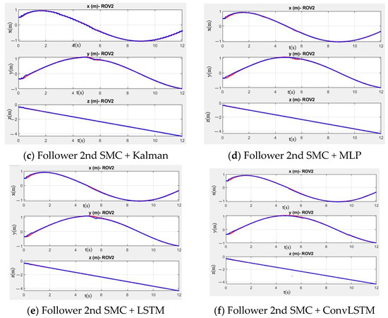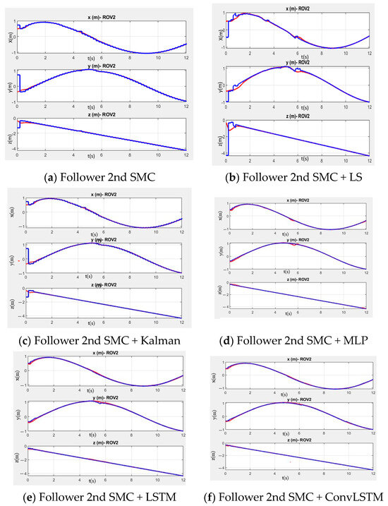 In Figure 11, the desired trajectories are represented in blue, while the trajectories followed by the ROV are in red. Each position is indicated on the corresponding graphs. In Figure 12a, with a sampling period of 200 ms and without any predictor, a phenomenon known as shattering is observed, similar to that shown in Figure 12a. In Figure 12b–f, various predictors are implemented that help reduce noise and improve the approximation to the desired trajectories.