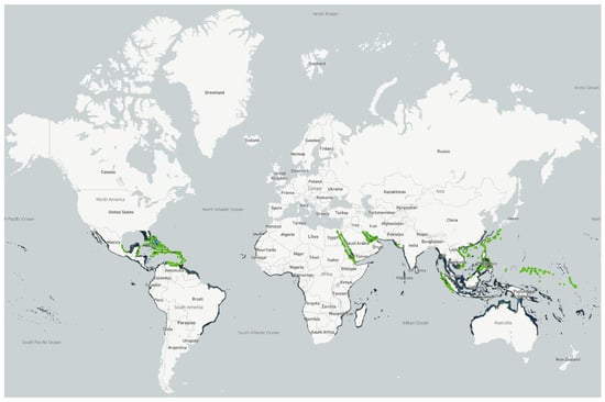 Coral reefs are some of the most diverse, productive, and complex marine ecosystems [1]. They are distributed between 30 degrees north and 30 degrees south in latitude from the equator and occupy almost 3% of the continental shelf area, as shown in Figure 1 [2]. Coral reefs have flourished thanks to the symbiotic relationships between simple tiny organisms called coral polyps and microalgae called zooxanthellae, which belong to the Symbiodinium genera, that live inside the polyp bodies. These symbiotic assemblages, called holobionts, live in colonies and build up a communal stony skeleton formed of calcium carbonate. Due to their physiological capacities, corals grow and survive in waters with high light penetration that are shallow, warm, and nutrient-poor (oligotrophic), in which this symbiotic interaction is key. The polyps provide nutrients to the zooxanthellae through their excreted waste, while the algae provide nutrients to the polyps through the photosynthetic process [3]. These corals, known as hermatypic reef-building corals, develop tridimensional life oases for many other marine species [2], supporting an estimated 25% of marine species in tropical regions [4]. The development of coral reef structures depends on the availability of hard bottoms (e.g., calcareous reefs or igneous rocks), light levels, and wave action. The development of the reef begins with the setting of coral larvae on hard bottoms, followed by coral colonies growing at a slow rate (of only a few millimeters per year), considering that the construction of a reef could take hundreds or thousands of years [2]. Several types of coral reef structures depend on habitat availability and environmental conditions, including patch reefs, in which the reef grows in shallow areas and is surrounded by sand; fringing reefs, which grow in different dimensions on islands and shelving rocky coastlines; and barrier reefs, which are more developed reef structures located on many tropical islands that are usually separated from the land by a lagoon with patch and fringing reefs [3].