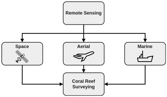 The enormous biodiversity that is characteristic of coral reef ecosystems has been affected by different human and natural disturbances, which has increased their vulnerability [47,48]. For this reason, several investigations have focused on the characterization and classification of organisms and their damage in these ecosystems, as it has been found that different methods can be utilized to provide a diagnosis of the health status of organisms [9,49,50]. In this way, the use of remote sensing technologies has been useful in aerospace and underwater matters (Figure 2). Monitoring and mapping applications using satellite imagery for this purpose have been reported in [50,51,52], while applications for the detection of coral bleaching and its analysis have been described in [53,54,55].
