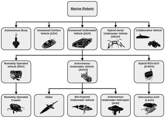 The definition of an “Underwater Vehicle” in the context of marine robotics refers to all small vehicles that are capable of propelling themselves beneath the water surface or on it, which includes Remotely Operated Vehicles (ROVs) and Autonomous Underwater Vehicles (AUVs) [117]. Both ROVs and AUVs share some automatic control problems, which is why they have collectively been called Unmanned Underwater Vehicles (UUVs) [105]. There are several challenges regarding the ongoing development and use of UUVs in civil and military applications. As such, the evolution from ROVs to AUVs has generated new challenges related to manipulation tasks in underwater enclosures, leading to the production of intervention AUVs and Hybrid Remotely Operated Underwater Vehicles (H-ROVs) endowed with manipulation capabilities [102,104]. In this review, three subcategories derived from the development of UUVs are defined: ROVs, AUVs, and H-ROVs and their derived marine robots, as depicted in Figure 3 and briefly described in this part. It should be noted that the evolution and improvement of UUVs are undergoing continuous progress, with developments depending on demand as well as challenges that require special and innovative designs [84,106,127].