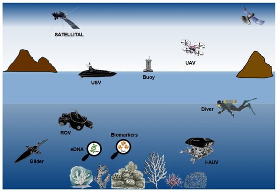 In recent decades, remote sensing technologies have been used to monitor large marine areas for the assessment of spatial patterns as well as to provide continuous observations for the assessment of temporal patterns. These technologies include satellite imagery, unmanned aerial systems, and marine robots (Figure 2). Such methods provide information about the coral reef ecosystem, including its extent, reef type, geomorphological zonation, reef substrate, and benthic structure [4,9]. In recent years, drones and small autonomous surface vehicles have been used for mapping and monitoring coral reefs in shallow areas (<20 m depth) [40,41]. Furthermore, remotely operated vehicles have been used to monitor benthic habitats and marine fish communities, yielding good results as well as new challenges [42,43]. This review aims to generate a synthesis of marine robotic technologies which are useful for mapping coral reefs and assessing the current biological status of reef ecosystems from both an ecological perspective (through the quantification of live coral cover, estimation of biological diversity, and quantification of the abundance of species that play important roles within the ecosystem) and a functional perspective (through the monitoring of molecular biomarkers indicating damage caused by environmental stress). Furthermore, this review recognizes the importance of using remote sensing and artificial intelligence tools for the implementation of continuous and long-term monitoring programs for marine ecosystems by providing information to help in making management decisions for their protection and conservation.