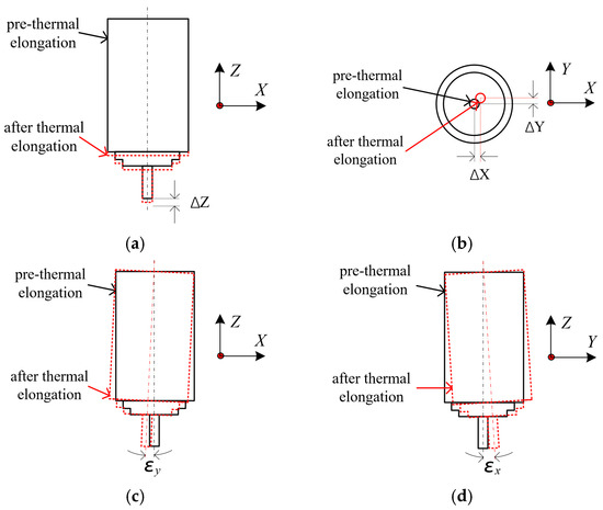 Error terms of the machine tool spindle: (a) Axial thermal elongation of the spindle, (b) Radial thermal drift of the spindle, (c) Yaw angle error of the spindle, and (d) Pitch angle error of the spindle.