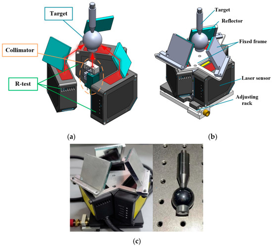 The measurement principle and overall structure of the measurement system proposed in this paper are shown in Figure 2. The displacement error of the spindle in the XYZ direction is measured by the laser triangle reflection displacement sensor relative to the surface of the precision ball, and the change in the ball center coordinates is calculated. The tilt error around the X-axis and Y-axis is measured by an autocollimator. During the measurement, the fixed part is installed on the workbench of the machine tool, and the target is installed on the measured spindle.