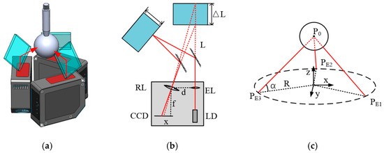 The spindle thermal drift error is measured based on the principle of laser triangulation, and the spatial position of the standard ball is measured by using mirrors oriented to change the projection direction of the laser beam. Its structure and measurement principle are shown in Figure 3a, including three non-contact laser displacement sensors (LDSs), the laser beam emitted from the laser diode (LD) collimated by the emitting lens (EL), three optical mirrors, and a standard ball evenly distributed. The actual measurement optical path of the laser displacement sensor and the equivalent measurement optical path are shown in Figure 3b, and the displacement value can be calculated according to Equation (1). According to the measured three displacement values, the standard ball center coordinates in the measurement coordinate system can be obtained by calculating the solution, and the measurement coordinate system is shown in Figure 3c. The laser beam of the laser displacement sensor is reflected by the mirror and shines on the target ball’s surface. The receiving lens gathers part of the diffusely reflected beam and focuses it on the photosensitive element. When the target surface produces a displacement, the position of the light spot on the linear array also changes, with the relationship described as follows: