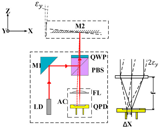 The spindle tilt measurement adopts the autocollimation principle for measurement, and the measurement principle is shown in Figure 4. Combined with the polarizing beam splitter (PBS), quarter-wave plate (QWP), and reflector (M1), a measurement optical path is formed. The P polarized light reflected by the fixed reflector (M2) at the target end passes through the PBS and focuses on the four-quadrant detector (QPD). The relationship between the angular errors εx and εy of the spindle and the position change in the focused spot on the QPD is as follows: