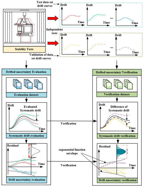 The definition and evaluation method for measurement equipment drift uncertainty are shown in Figure 5. Under the same experimental conditions, N repeated independent tests are conducted on the long-term drift of the instrument, and the probability distribution of the drift curve is depicted. The drift curve of the instrument comprises drift systematic errors and drift residuals. The drift systematic error represents the average value of the long-term drift curve obtained from N drift tests, which varies with time. After subtracting the drift systematic error, the residual drift curve is obtained, and its residual distribution increases with time. This means that the magnitude of the drift uncertainty and the confidence interval of the measuring instrument are correlated with the time variable.