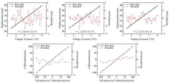 The calibration of the laser displacement sensor after installing the reflected optical path is performed using a high-precision micrometer (type 805-5506, SYLVAC) as the reference. The calibration mechanism design is shown in Figure 9a, with a calibration stroke of 10 mm. The measurement accuracy of the tilt angle is calibrated using a multi-degree-of-freedom laser interferometer (XM-60, Renishaw, with an angular measurement accuracy of ±1 arcsec) as the reference. The design of the calibration mechanism is shown in Figure 9b, with a calibration stroke of ±100 arcsecs. The final calibration results are shown in Figure 10. The calibration results indicate that, within the 10 mm measurement range of the sensor, by comparing this with the angles measured by a dial indicator or a laser interferometer, the residual error is obtained. The calibration residuals of the laser displacement sensor are all ±3 μm or under within 200 arcsecs and the calibration residuals of the tilt angle measurement are within 1.5 arcsecs, both meeting the high-precision error measurement requirements of the spindle.
