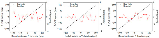 The calibration of three-dimensional displacement is performed on a precisely error-compensated CNC machine tool (HMC400 Pro, HIMILE, ±3 μm/500 mm after compensation) using the high-precision micro-movement of the machine’s linear axes. Based on the actual coordinates of the machine tool, calibration is carried out within ±100 μm in the XYZ directions, with a step size of 20 μm. The calibration setup is shown in Figure 11, and the calibration results are presented in Figure 12. The results indicate, that within the ±100 μm measurement range of the instrument, the calibration residuals for the XYZ coordinates are all within 2 μm. Using the precisely calibrated coordinate movement of the CNC machine tool as a reference, the readings from the instrument developed in this paper are subtracted to obtain the residual error.