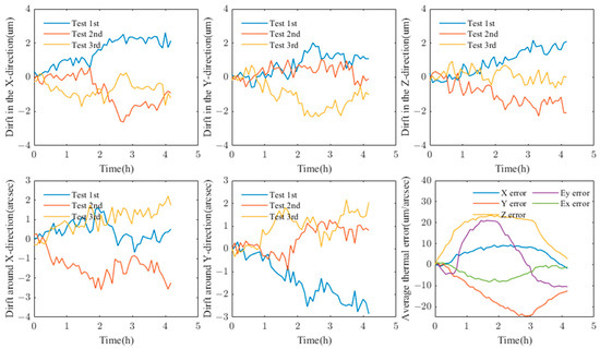 From the experimental results, it can be seen that, after deducting the average value of the thermal error measurement data of the machine tool, the residual errors of the three measurements are slightly larger than the drift uncertainty of the instrument evaluated in the previous stage. This is because they include the uncertainty of the thermal characteristics of the machine tool itself, which will also be one of the key issues in our subsequent research.