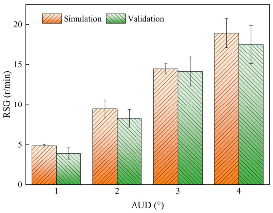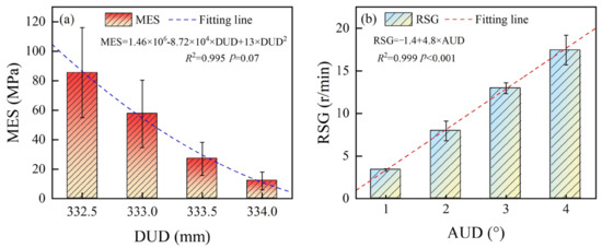 In this study, AUD had a highly significant influence on RSG, MRDF, ARDF, and ARDP (p < 0.01), and a very significant influence on MRDP (p < 0.05), but no significant influence on other experimental indexes. Simultaneously, a positive effect of AUD on RSG, MRDF, ARDF, ARDP, and MRDP was also found. The reason may be that (1) during the drawing process of the glass tube, three upper drawing wheels and three lower drawing wheels pressed the glass tube and provided the driving force. The axial driving force along the axis of the glass tube propelled its forward movement, while the tangential driving force caused its self-rotation; and (2) due to the constant rotational speed of the drawing wheels, RSG reached a constant value, but the acceleration of the glass tube was determined by the friction between the drawing wheels and the tube. However, AUD had nonsignificant effects on MES, MFDF, AFDF, TEC, TPD, AFDP, and MFDP. The reasons may be that (1) AUD only affected the tangential driving force component of the glass tube, while MES was influenced by the pressing force from the drawing wheels, leading to the nonsignificant influence on MES; (2) during the drawing process, the forward driving force, which equals the total driving force multiplied by the cosine of AUD, varied minimally (cosine of AUD ranging from 0.9962 to 1) since the AUD range was between 0° and 5°, resulting in the nonsignificant influence of AUD on MFDF, AFDF, MFDP, and AFDP; and (3) the main energy consumption arose from overcoming the friction between the glass tube and the six drawing wheels, and from the wheels driving the tube along the axial direction. The energy consumed by driving the rotation of the glass tube was relatively low compared to driving its forward movement. Therefore, the nonsignificant influence of AUD on TEC and TPD was observed. Importantly, AUD is a key factor in the drawing process, as the rotational forces on the glass tube from the Danner machine are regulated by adjusting the AUD of the drawing wheel. Additionally, an excessively large AUD increases the rotational torque of the drawing wheels, leading to an increased risk of deviation of the glass tube from its original position. This deviation raises the pressure between the glass tube and the guiding device, increasing the risk of tube breakage.