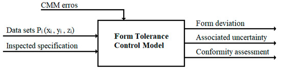 Coordinate measuring machines are widely used in the industrial field due to their ease of automation. However, estimating the measurement uncertainty is a delicate task, especially when controlling for deviation, given the large number of factors that influence the measurement. A precise estimate of the uncertainty is crucial to avoid incorrect conformity assessments. The purpose of this study is to control geometrical-form tolerance specifications, taking into consideration their associated uncertainty. A surface fitting model based on the least squares criterion is proposed, allowing one to obtain the variance–covariance matrix by iterative calculation according to the Levenberg–Marquard optimization method. The form deviation is then evaluated following the Geometrical Product Specifications (GPS) Standard, and its associated uncertainty is estimated using the guide to the expression of uncertainty in measurement (GUM) propagation of the uncertainty law. Finally, the conformity assessment is performed based on the measured deviation and its associated uncertainty. Different results for the measurement of straightness, flatness, circularity, roundness, and cylindricity are presented and detailed. This model is thereafter validated by a Monte Carlo simulation, and interlaboratory comparisons of the obtained results were performed, which showed satisfactory outcome. This contribution is of great use to manufacturing companies and metrology laboratories, allowing them to meet the normative guidelines, which stipulates that each measurement result must be accompanied by its associated uncertainty.
