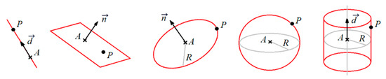 Parametrization of the studied elements: line, plane, circle, sphere and cylinder.