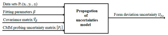 The form deviation is subsequently calculated from the data sets and the fitting parameters , by determining the extreme points M and m as detailed in Section 2.3. Therefore, based on the form deviation equation , the GUM law of uncertainty propagation is applied, as shown in Figure 7, and the result is expressed in matrix form as .