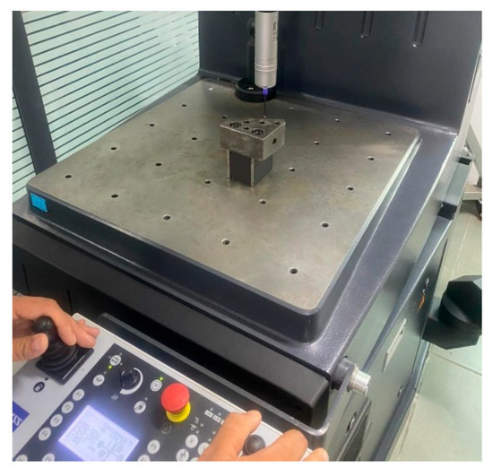 As shown in Figure 8, the CMM used is a Mitutoyo Euro-C 544 (Kanagawa, Japan), with a measuring volume of 500 × 400 × 400 mm3. It offers an MPE (Maximum Permissible Error) for length measurement of 2.9 + 4 L/1000 µm within the temperature range of 18 °C to 22 °C coupled with a TP2 type probe head mounted with a tungsten carbide stylus of effective working length EWL = 14 mm and a ruby tip of diameter D = 2 mm, all controlled by Mcosmos Geopack software. The temperature is regulated at 20° ± 2 °C and the probing speed is set to 10 mm/s.