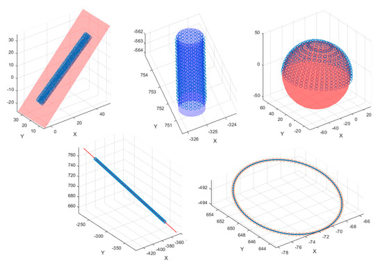 Subsequently, we perform surface fitting to obtain the fitting parameters β. The resulting fitting covariance matrix is then utilized for uncertainty estimation. Figure 9, Figure 10, Figure 11, Figure 12 and Figure 13 illustrate the probed points and the fitted features for the line, plane, circle, sphere, and cylinder. The form deviation is evaluated by identifying the two extreme points and . The Jacobian matrix is computed, and the variance–covariance matrix is constructed, allowing us to accurately estimate the form deviation and its associated uncertainty calculated as .