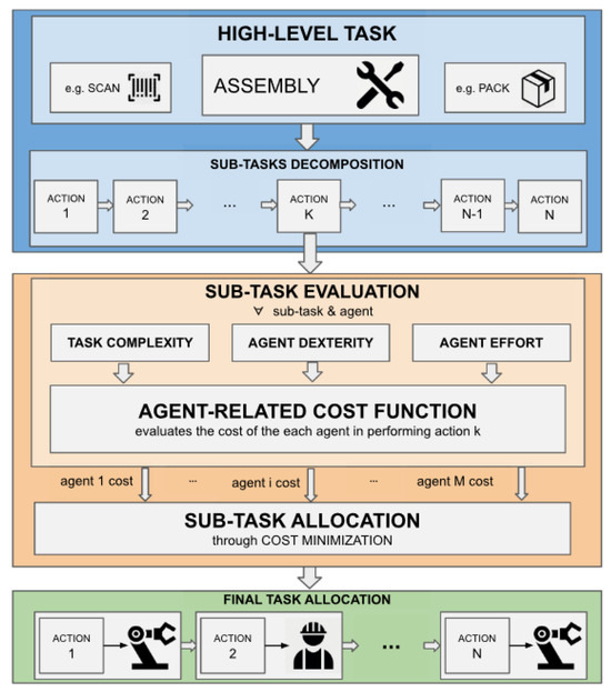 When robots and humans work together, proper planning is required to ensure safe interaction and a productive environment. One aspect of planning is task allocation or assigning proper tasks to both human individuals and robot entities. This ensures a smooth workflow and prevents overloading for any single participant. Lamon et al. [22] look at allocating tasks in manufacturing scenarios based on a robot’s physical characteristics. The experiment looks at the physical capabilities of robot agents and human workers and then allocates tasks accordingly. Figure 3, taken from the paper, explains how tasks are broken down into a series of actions. These actions are assessed by the algorithm to determine whether they should be completed by a human or robot agent and are then allocated accordingly. The solution proposes which tasks are better suited for robot agents to remove easily physically fatiguing tasks from human workers. The results proved that tasks allocated by physical characteristics are suitable for fast-reconfigurable manufacturing environments. Another way to allocate tasks is by looking at trust [22]. Rahman et al. [23] consider the two-way trust of human trust in robots and human trust when creating a system that allocates and reallocates subtasks based on trust levels. Real-time trust methods and computational models of trust are used to calculate trust levels in both humans and robots. Subtasks are allocated using these calculations and reallocated in real time if trust levels drop. The results show that the allocation of subtasks and re-allocation based on trust lead to improved assembly performance compared to considering human trust alone or no trust at all.