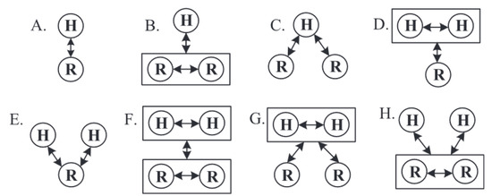 Different categories of human–robot teamwork [28]. In each case, a human is depicted by a circle labeled with an “H,” whereas a robot is illustrated by a circle containing an “R.” Double headed arrows indicate command flows between the humans and robot.