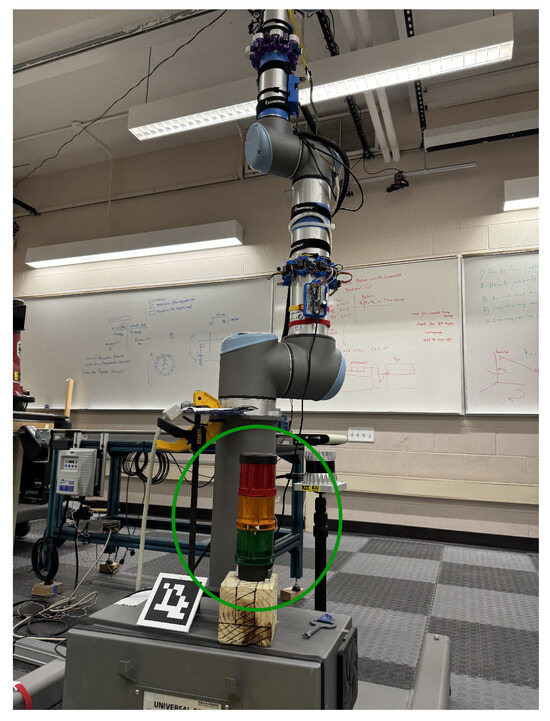 Lastly, safety concerns are important in HRI, as the close physical interaction between humans and robots in environments such as manufacturing and assembly lines introduces the risk of collision. Without real-time feedback and communication, it is challenging to ensure that both humans and robots can anticipate and respond to each other’s movements, potentially leading to hazardous situations [58,59,60,61]. Although solutions such as flashing lights have been created to show the whereabouts of the robots, unless the light is always in constant view of the user, it cannot always be useful and reach its full potential for ensuring safety and Situational Awareness [43]. Figure 7 shows an example of lights near a collaborative robot that lights up to show the robot is in motion.