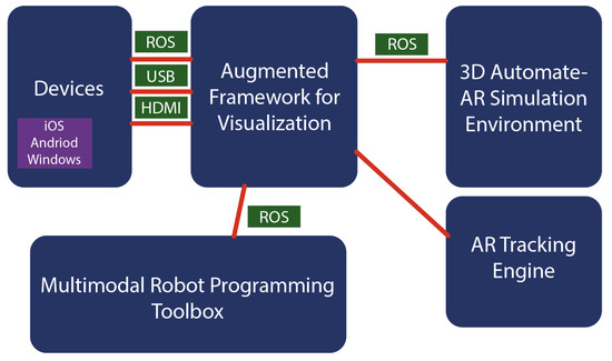 Recent research has found that AR enriches path planning and training by offering a virtual approach rather than a physical one, making operations safer, easier, and more flexible [65]. AR can be used to understand a robot’s status and planned actions, discuss and review plans with robots, and generate optimal plans before implementing them. Fang et al. [65] utilized AR to plan the path of an industrial robot. Despite encountering accuracy errors in their case study due to the application system, the concept of AR path planning was generally considered a success. Doil et al. [66] explored the use of AR in planning manufacturing tasks by placing virtual robots and machines within a real-world workspace to map out a manufacturing layout. This approach eliminates the need to model the work environment as required in a VR-based version, streamlining the planning process. Similarly, assembly workstation planning using AR is explored by Wang et al. [67]. The researchers developed an AR system that enables HRC assembly simulation based on current human worker mapping and motion data. This system allows operators to design optimal HRC assembly lines that mimic human assembly lines efficiently and cost-effectively. In HRI training, AR technology often provides virtual simulations of real-life interactions and situations, helping individuals better understand and become comfortable working with robots. Bischoff et al. [83] identified robot operation training as the most promising area of AR research in this field. When training with AR, human operators can safely practice complex tasks. Andersson et al. [68] developed a system that facilitates AR-based training, enabling this safe and effective learning environment. The system is divided into four main parts, interconnected via a Robot Operating System (ROS), to ensure flexibility and extensibility. The multimodal robot programming toolbox allows for various programming tools to interact with a data model through parameter requests, enabling the user to select desired tools during runtime, such as PbD or free drive mode, to define robot poses or trajectories. This is presented visually in Figure 8. In contrast, Matsas et al. [84] present a similar training system that utilizes VR and is entirely virtual, without incorporating real-world elements.