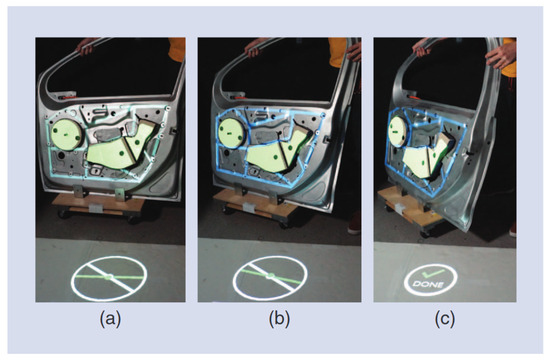 Projected instructions for car door alignment. (a) The starting projection for a car door alignment task. (b) The projection moving as the car door aligns. (c) Ending projection with the “Done” visualization [8].