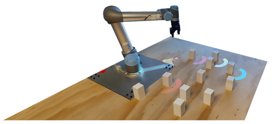 Interaction in HRI often uses AR to promote fluency and productivity between humans and robots. This typically involves conveying the robots’ upcoming plans and actions, allowing users to interact with robots intuitively. De Franco et al. [72] take a similar approach to promote natural interaction between robots and humans by creating an AR system that allowed humans to view the robot’s status and future actions for collaborative tasks. Using an AR headset, the robot provided feedback to the human user, enabling them to understand the upcoming steps and be prepared. This improved their performance and was deemed helpful by 10 participants [72]. Andronas et al. [73] also promoted natural interactions using a Human–System and System–Human interaction framework. This framework allows robots and humans to communicate important information back and forth while completing their tasks. In general, the system increased operator trust and awareness and reduced human errors. Similar interaction systems can also be operated through smartwatches. Gkournelos et al. [74] promoted HRI interactions through a hybrid approach involving smartwatches. This method significantly aided the operator in integrating into an assembly line. Another approach to Human–Robot Interaction using AR is by allowing robots to manipulate virtual elements in a shared Augmented Reality workspace. In this setup, robots do not assist in the physical world but rather work proactively with humans by offering cues in the virtual augmented world. Qiu et al. [75] developed an experiment to test this setup and found that it worked effectively and could be useful for the future of HRC. Outside of the virtual world and elements, the AR interaction can also be projected onto a work surface to provide information about the robot’s upcoming actions and intentions. Sonawami et al. [76] used projection mapping to display visual cues, highlighting the objects that human beings need to interact with. As seen in Figure 10, the robot’s shadow is projected, highlighting its status. Additionally, the colored semi-circles show users which blocks are safe to pick up. The results show that projection mapping improved safety and task efficiency.