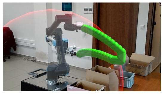 The AR visualization seen through an HMD that visualizes the robots’ upcoming motions in green and the safety zone in red [59].