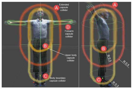 AR can make HRI conditions safer, but there are also mental and physical risks associated with the use of AR in environments with potentially dangerous robots. Bahaei and Gallina [88] created a framework called FRAAR (Framework for Risk Assessment in AR-equipped socio-technical systems) that can be used for the assessment of the risk of both social and technical issues that can arise when AR is introduced into any robot manufacturing system. Safe practices can also mean the maintenance and upkeep of a running system. Eschen et al. [79] utilized AR for the inspection and maintenance in the aviation industry. In a broader sense, Papanastiou et al. [80] and Makris et al. [81] both developed AR systems designed for operators to maintain safe and integrated environments in human–robot manufacturing settings. The accuracy of these safety measures is usually not precise, but instead, they are activated early to avoid human–robot collisions. This means that robots will be interrupted from their work and forced to stop moving very often, which can hurt the flow of a workspace. To minimize interruptions and maximize workflow, Matsas et al. [82] used proactive and adaptive techniques in a virtual immersive environment to test the performance metrics of a robot’s safety enhancements. This approach aims to obtain precise measurements of how close a human can be before a robot is forced to stop. A virtual human body model is created and analyzed to determine the appropriate distances from the body that should trigger the robot’s motion-stopping feature. Figure 12 shows the diagram of this body model.