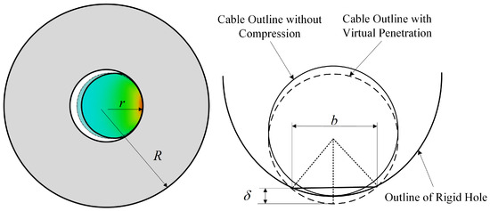 When the cable is compressed, the cable-hole contact area increases because the hole contour is trapped inside the cable. Using the Kik–Piotrowski theory of virtual penetration, the width of the compressed part of the cable can be regarded as the string length of the virtual penetration of the cable and hole, as shown in Figure 4. Therefore, according to the cross-sectional characteristics of the cable hole contact, the virtual penetration can be calculated as: