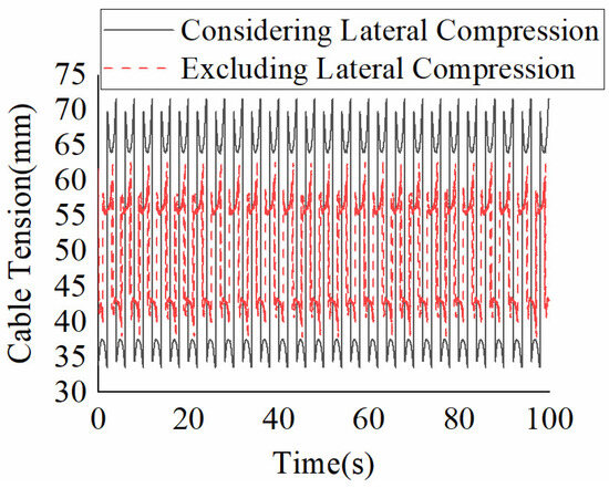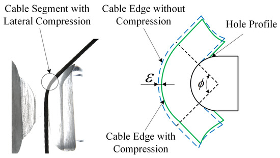 There is an extrusion effect between the cable and the hole. In fact, due to the cable being composed of multiple strands of wire spirally wound together, there are multitudinous gaps between these strands, leading to the actual radial stiffness being quite lower than that of the equal diameter structure with the same material. With the cable-hole extrusion effect, the spatial arrangement of the strands becomes denser, causing the cable to be prone to lateral deformation. Hence, in Equation (2), will not be equal to the cable diameter.