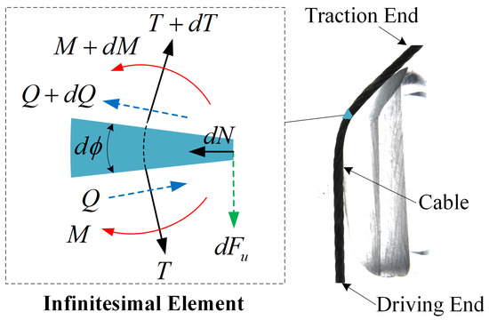 The external forces acting on the cable in the hole include the tension at both ends of the hole, the pressure, the friction, and the indentation resistance as shown in Figure 6 and Figure 7. With these force functions, the cable element in contact with the hole undergoes bending, shearing, and axial compression. The cable mass in the hole is small enough and can be ignored. Therefore, the force balance equation of the cable element can be written as: