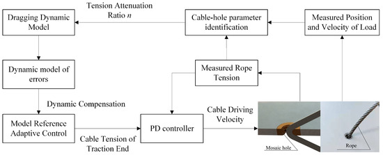Due to the tension attenuation with the cable threading through the hole, the driving force cannot be accurately transmitted to the load. To reduce the motion control error and compensate for the tension attenuation of the cable-drive mechanisms, the control law of the driving end tension can be designed based on the tension ratio model of cable-hole transmission. The control frame of the driving end tension designed in this paper mainly consists of two parts: the cable-hole parameters identification and the tension adaptive compensation, as shown in Figure 8. The cable-hole parameters identification is used to reduce the parameter uncertainty, utilizing the PSO algorithm to calculate unknown parameters of the tension ratio. The adaptive compensation of cable tension is applied to reduce the model uncertainty. Based on the model reference adaptive control method, a control law of the driving end tension is designed to ensure the position error of the towed end asymptotic stability.