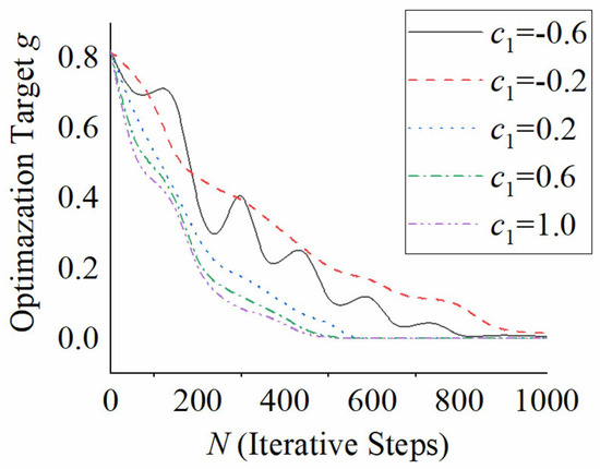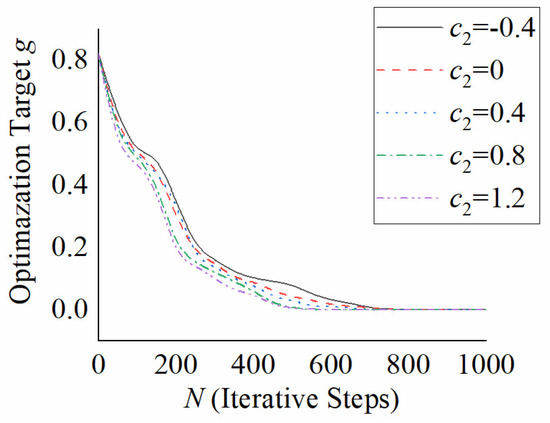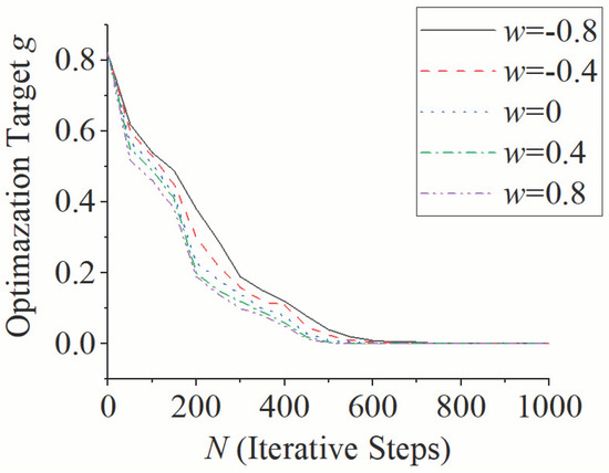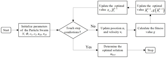 where, w is the inertia weight factor; and represent positive learning factors; represents the optimal value of the i-th particle up to step , which is the value of guaranting g of Equation (23) minimization from to ; represents the optimal value among all particles up to step , which is the position of the particle guaranteeing g of Equation (23) minimization from step 0 to step k among all particles; are random parameters of PSO algorithm.
