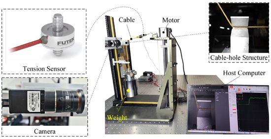 To validate the cable tension ratio model and the cable tension adaptive compensation method, a cable-hole validation prototype was designed and manufactured, as shown in Figure 10. The prototype mainly consists of a cable pulling mechanism, a special fabricated hole, a vision camera and a tension sensor. The cable pulling mechanism is a ball–screw pair driven by a high-precision stepper motor (AZM46AC, Oriental Motor, Tokyo, Japan) which can ensure accurate tracking for revolution velocity and position, and the accuracy can reach 0.01°. The special fabricated hole is made of transparent organic glass, which is convenient for light transmission and visual measurement. A 40-megapixel color industrial camera (MV-CS050-10GC, Hikrobot, Hangzhou, China) is used for visual measurement, which can ensure the cable deformation measurement accuracy of 0.01 mm. The measurement range of the tension sensor is 0 N-10 0N (LCM100-FSH03827, Futek, Irvine, CA, USA), and the measurement accuracy of the tension can reach 0.1 N. The tension at the driving end of the cable is measured by the tension sensor, and the tension ratio of the cable-hole transmission can be calculated in conjunction with the towed weight: