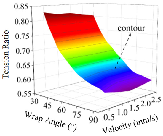At the cable-hole contact area, the cable adheres to the inner surface of the hole and generates sliding friction with the hole. Besides the wrap angle, another parameter that represents the geometric properties of the cable-hole or cable-wheel contact surface is the diameter ratio, as shown in Equation (2). Unlike the cable-wheel contact, the inner diameter of the hole cannot be ignored compared to the diameter of the cable. Therefore, the cable-hole diameter ratio is an important parameter that cannot be ignored when evaluating the tension attenuation properties.