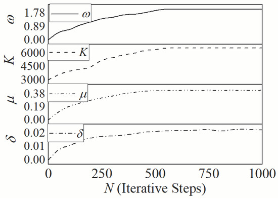 Using the iterative method shown in equation Equation (25), when the maximum number of iterations is reached or the global optimal position meets the error requirement, the iterative calculation stops. At this time, the obtained global optimal value of particle swarm is the parameter to be identified, and the specific calculation process is shown in Figure 9.