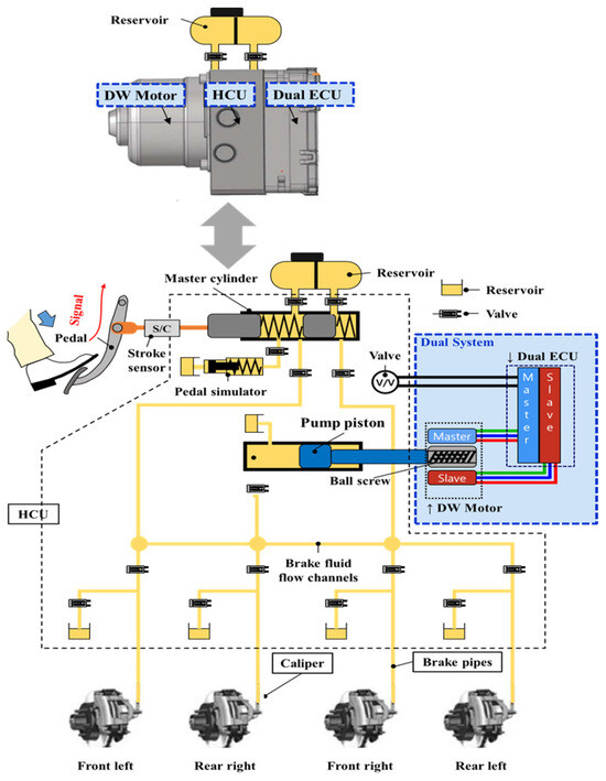 The IEB system is mainly composed of a hydraulic control unit (HCU), a dual electronic control unit (ECU), and a motor, as shown in Figure 1.