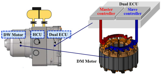 As the driving level of a vehicle increases, the intervention of the driver decreases, making it necessary to secure vehicle safety technology in case of an emergency. Therefore, as the level of autonomous driving increases, the importance of fail safety and redundancy systems of automobiles also increases [6,7,8,9]. To enhance the fault tolerance of autonomous vehicles, current research focuses on multi-phase drives that offer superior reliability compared to traditional three-phase drives. These drives leverage phase redundancy to ensure continuous operation even in the event of a fault affecting a specific phase. In [10], N. Bianchi studied a five-phase permanent-magnet motor designed to handle phase faults by redistributing the current among the remaining phases, thereby maintaining operation and reducing torque ripple and noise. Similarly, in [11], M. Bermúdez discusses a multiphase induction machine within a phase-redundant AC drive system, highlighting its ability to continue operating despite phase failures through advanced fault diagnosis and control strategies. Moreover, in [12], G. A. Yepes provides a comprehensive survey of recent advances in fault tolerance for multiphase AC drives, emphasizing the importance of enhanced diagnostic capabilities and fault-tolerant design methodologies in various high-reliability applications. However, multiphase drives have a critical flaw: under unexpected overload conditions, all phases and motor slots can be damaged, posing significant fail-safety issues. This vulnerability necessitates the exploration of alternative solutions to improve the reliability of these systems. Also, multi-phase drives necessitate sophisticated controllers, and the shared power source among phases poses a risk of complete operational failure in the event of a power issue.