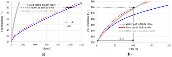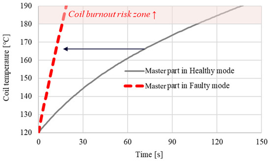 Due to the difference in the number of turns between the master and the slave part of the optimization model, the current used in the master part with many turns is small. The currents used in master and slave parts are 26.78 A and 28.77 A in the healthy mode and 53.57 A and 57.53 A in the faulty mode, respectively. Thus, the loss in the master part is about 17.8% less than that in the slave part, so the coil temperature in the master part rises more slowly than in the slave part.