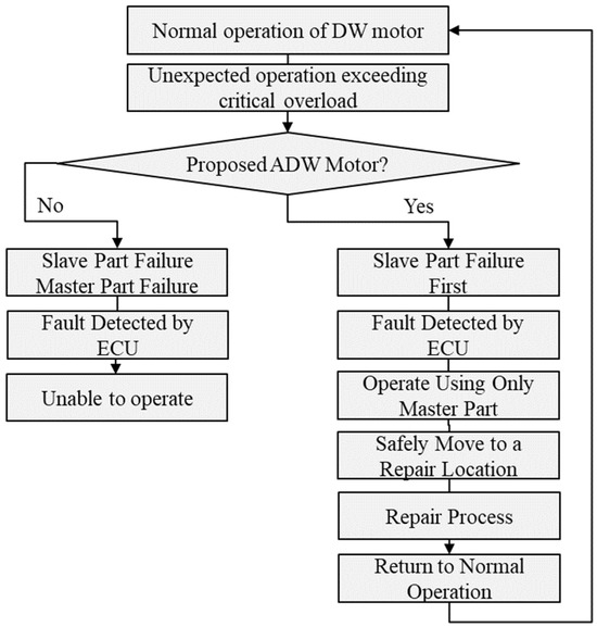When a faulty mode occurs, it can be repaired after moving the vehicle to a safe place without driving anymore. However, if the vehicle encounters an unexpected situation on a high-traffic road, it may be necessary to drive it in the faulty mode for a longer period of time. If all these emergencies are considered, it is necessary to design the DW motor to be more robust so that no heat problem occurs, even during faulty operation. Thus, a more improved fault-tolerant design process is needed for DW permanent magnet (PM) motors considering the problems in both the healthy and faulty modes. Figure 5 illustrates the expected failure sequence when a fault occurs. The proposed ADW motor demonstrates that even under overload conditions, simultaneous burnout of the master and slave parts is prevented.