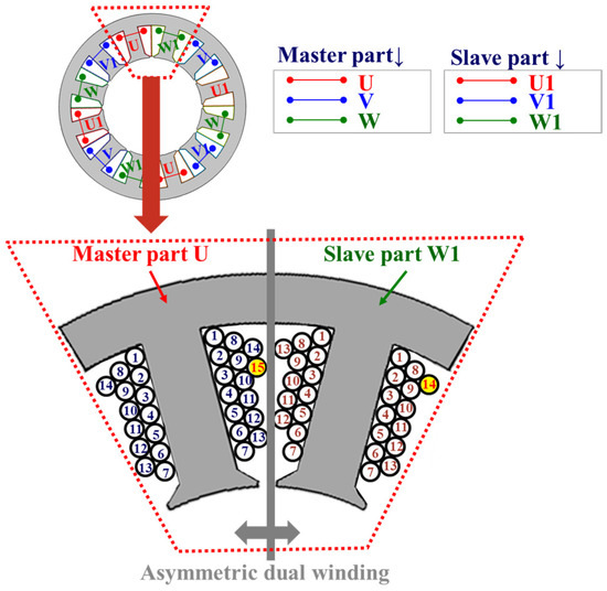 In order to solve these issues, several solutions have been explored in previous works [16,17,18], including the development of predictive thermal models and innovative motor designs aimed at addressing both simultaneous burnout in the healthy mode and overheating in the faulty mode. One such approach is a proposed asymmetric dual winding (ADW) motor with different coil temperature rises in the master and slave parts [16]. It has the advantage of preventing simultaneous burnout of master and slave parts. However, overheating in the faulty mode, the second problem of conventional DW motors, still exists. To solve the second problem of overheating in the faulty mode, research on predicting the coil temperature of the motor [17] or redesigning the DW motor is being conducted [18]. While these approaches contribute valuable improvements, they primarily focus on mitigating overheating in the faulty mode and do not fully resolve the issue of simultaneous coil burnout in the healthy mode, a gap that remains critical in the overall reliability of DW motor systems. Therefore, this paper proposes a design process for a thermal fault-tolerant ADW motor that simultaneously considers the problem of simultaneous burnout of the master and slave parts in the healthy mode and overheating in the failure mode of a conventional DW motor. Also, a lumped-parameter thermal network (LPTN) with piecewise stator-housing modules (PSMs) was employed for accurate thermal analysis of the DW motor under both healthy and faulty operational conditions. Due to the thermal fault-tolerant design implemented in the ADW motor, it was confirmed that it is possible to design an ADW motor that solves the two problems of simultaneous burnout in the healthy mode and overheating in the faulty mode.
