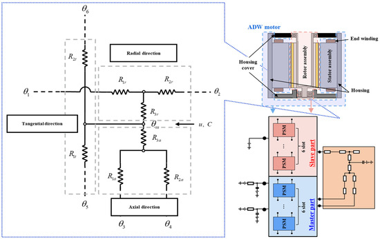 The LPTN incorporating PSMs is applied to perform an accurate thermal analysis of the DW motor under both healthy and faulty operational conditions [17]. The heat transfer coefficient values required for this analysis are obtained through optimization using a surrogate model based on the experiment results. The thermal equivalent circuit accounts for radial, tangential, and axial heat transfer, with the stator assembly divided according to the number of slots. Additionally, the thermal resistance calculation is based on a cylindrical component segmented to calculate resistances in all heat transfer directions. This allows for the estimation of the coil temperature increase during faulty operation when only a single winding of the DW motor is utilized. Figure 8 illustrates the concept of LPTN employing PSMs, and the equations are as follows: