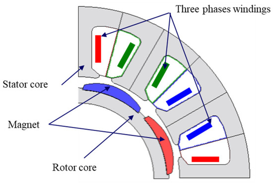 In order to verify the effectiveness of the thermal analysis using the LPTN with PSMs, the measurement data of a previously developed conventional three-phase PM motor, which serves as the base model, are compared. Figure 9 illustrates the topology of the base model, which is an 8-pole 12-slot surface permanent magnet (SPM) motor. Detailed specifications are shown in Table 1.