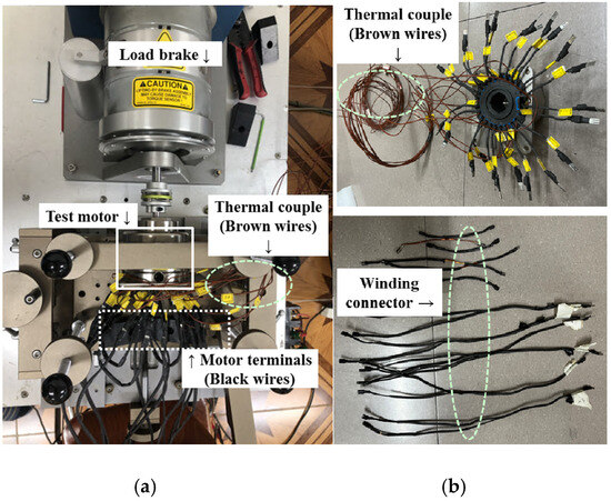 Experimental setup for the thermal test of the base model. (a) Test bench setup; (b) test motor and winding connectors.