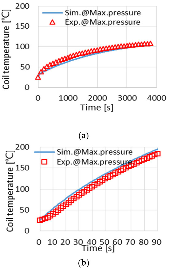 Figure 11 shows the coil temperature rise, comparing simulation results with experimental data, under a pressure load of 130 bar and an output torque of 3 Nm.