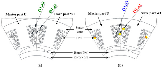 In step I, design variables and objective functions are selected for the proposed thermal fault-tolerant ADW motor design as follows. In this study, to minimize the development cost, a dual-redundancy system was developed based on an existing three-phase winding motor. Existing motors are expressed as a base model. To use the stator core of the existing base model as it is, the proposed fault-tolerant ADW motor was designed by changing only the winding specifications of the master and the slave parts and the stack length of the stator without changing the slot dimension and the winding fill factor of the stator, as shown in Figure 7.