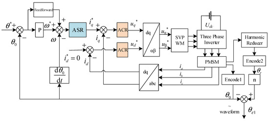 Although this control strategy is robust and the algorithm is reliable, it only controls the position of the motor output bearing without considering the influence of external disturbance and the gear meshing error of the harmonic reducer, resulting in poor output accuracy of the joint module. In Figure 4, ASR is an automatic speed regulator, which is a speed loop controller. ACR stands for automatic current regulator, which is a current loop controller.