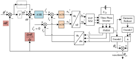 In response to the shortcomings of the first scheme as shown in Figure 4, some studies read the encoder value of the harmonic reducer end as the position input for vector control, as shown in Figure 5. The position value θr of the harmonic reducer encoder is read, multiplied by the drive ratio n of the robot joint module, and used as the position feedback signal of the PMSM, to realize the closed-loop control of the system. The control strategy improves the control precision and is applied in some situations with a low response requirement and lightweight load. However, if the effect of the harmonic reducer transmission error is considered, the actual position of motor θ0 cannot be calculated by the actual position of joint module θr. When the robot works at high speed, heavy load, and strong disturbance, it easily results in the oscillation of the position loop algorithm.
