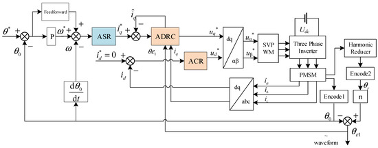 - This article expands the research topic of ADRC and studies the harmonic reducer and the PMSM as a whole control object. In robot motion control, traditional ADRC studies the dynamic performance, steady-state accuracy, and disturbance rejection ability of the PMSM output shaft. In fact, the motion angle output of the motor is converted by the harmonic reducer to obtain the motion angle of the robot. During this angle conversion process, there are important factors that affect the accuracy of robot motion, such as gear deformation, load disturbance, and mechanical vibration. Even if the PMSM achieves precise control of motor output, the accuracy transmitted to the end of the robot is greatly reduced, which is also the difficulty of robot accuracy control. This article adopts a new approach, which differs from the traditional approach of only controlling the output shaft accuracy of the PMSM. The harmonic reducer model is integrated into the PMSM control strategy to redesign the ADRC controller. By adjusting the output of the ADRC torque loop to counteract these uncertain torque disturbances, the control accuracy can be improved.
